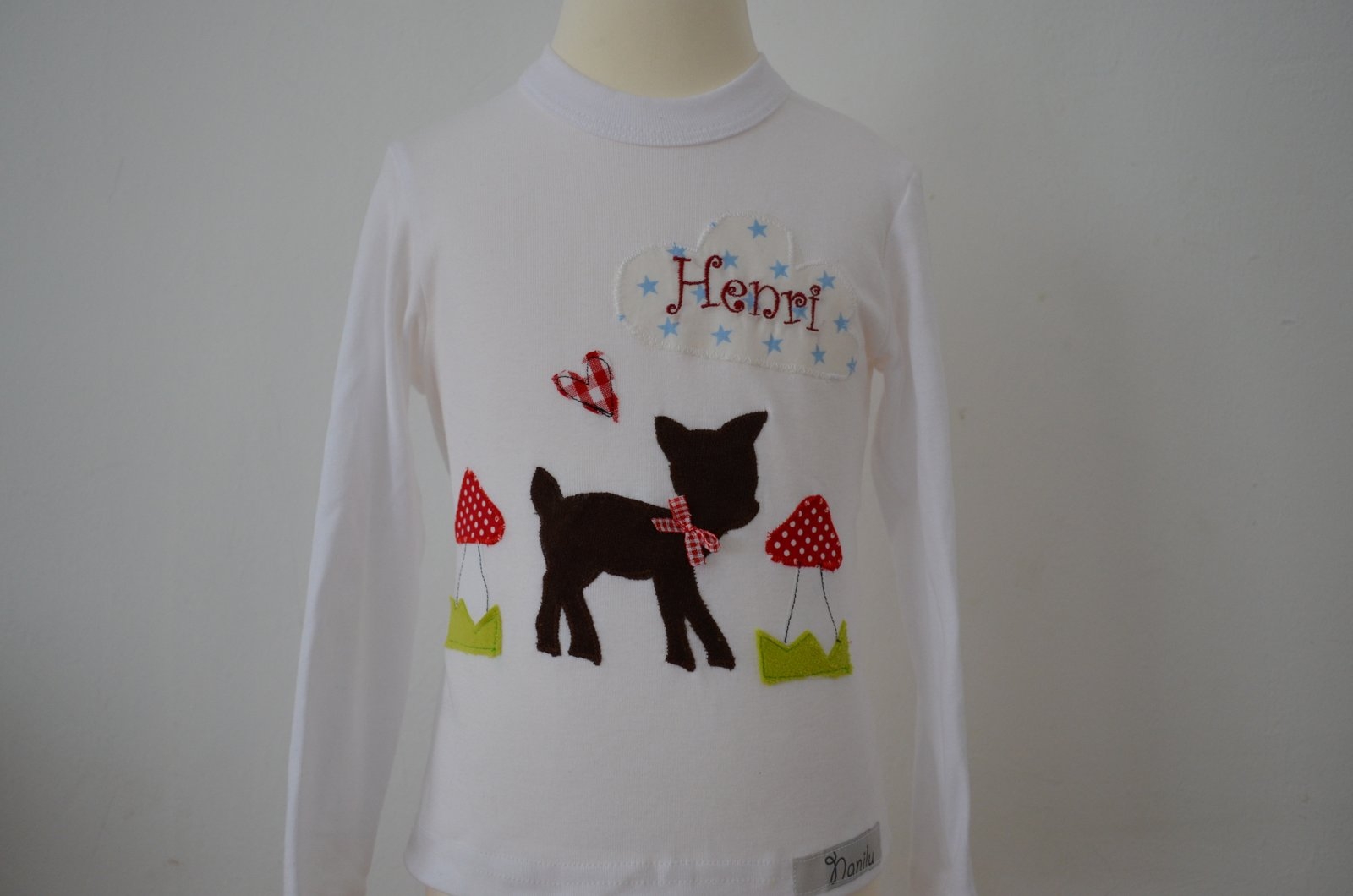 Das T-shirt ist appliziert mit Rehkitz und Flliegenpilze und bestickt mit Ihrem Wunschnamen !