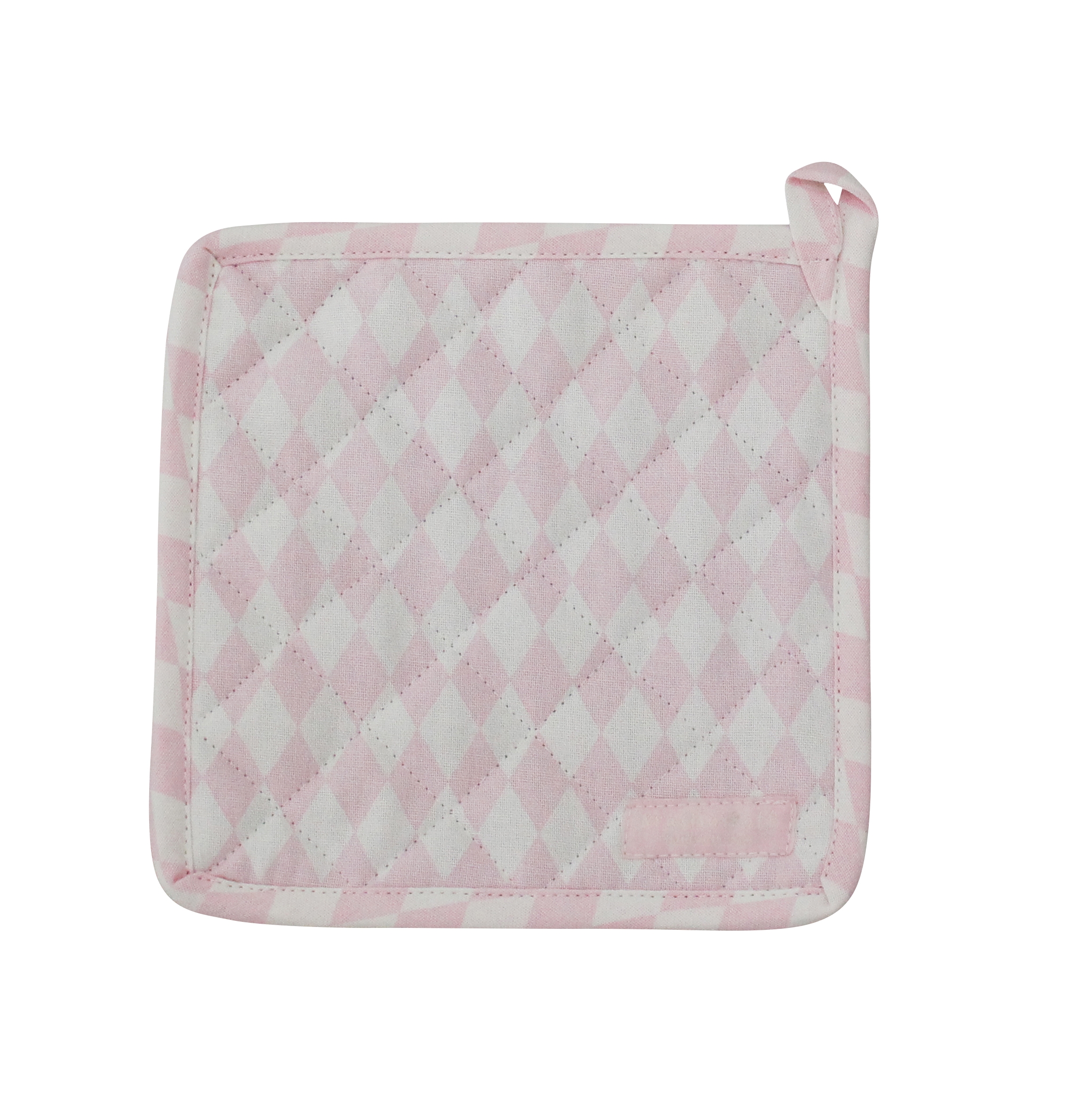 Weißer Topflappen aus 100 % Baumwolle, bedruckt mit rosanen Rauten im Harlekin Design.