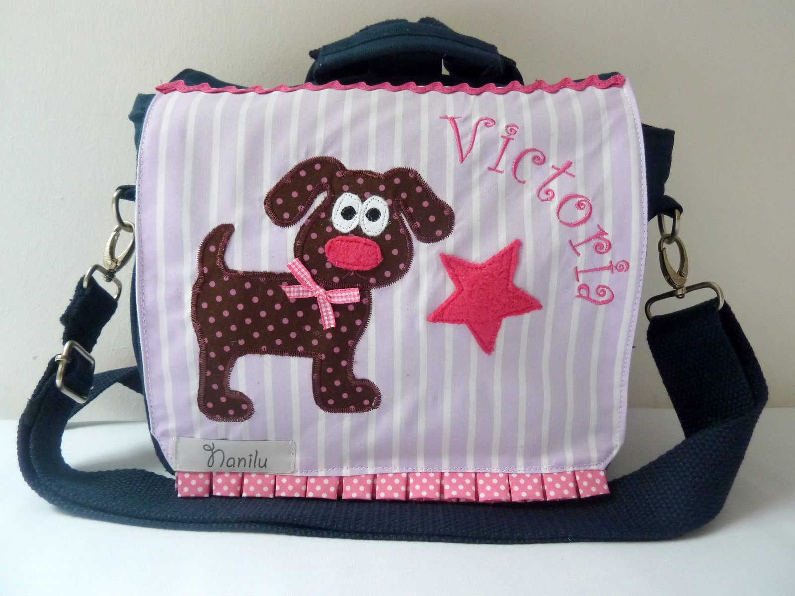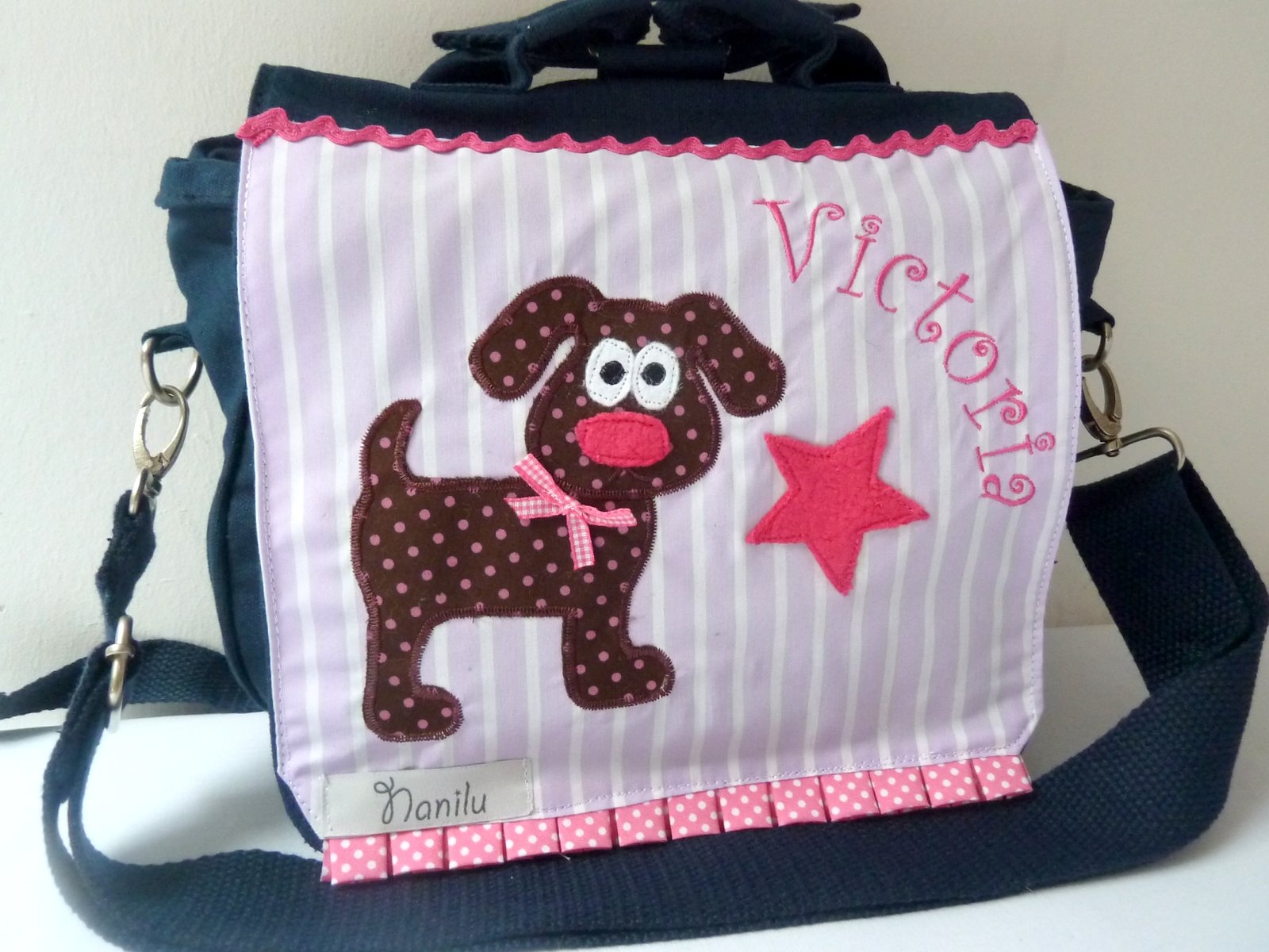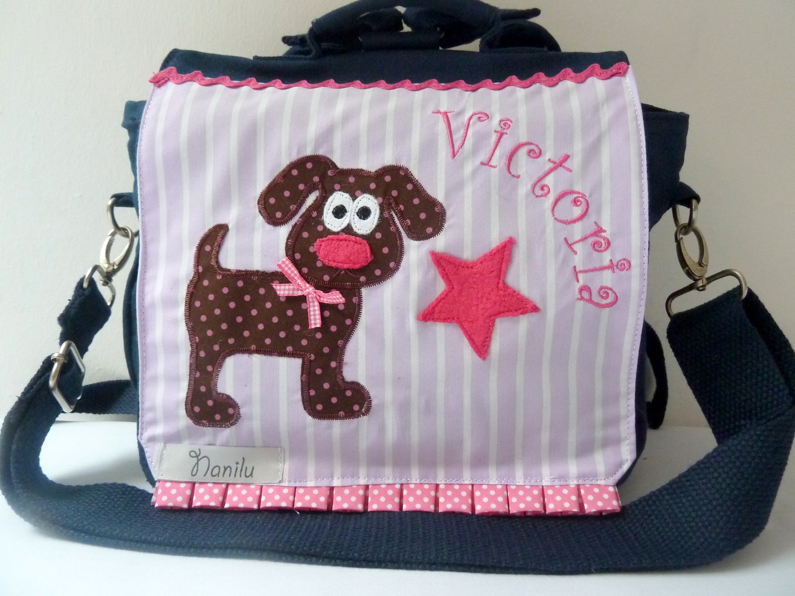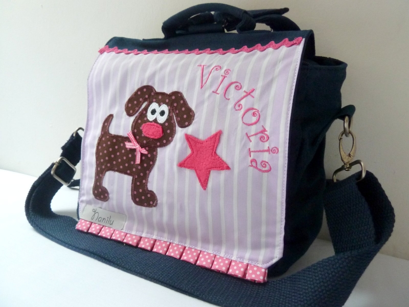 Die Tasche ist mit eine aufwändige und sehr schöne Applikation und Ihrem Wunschnamen bestickt.