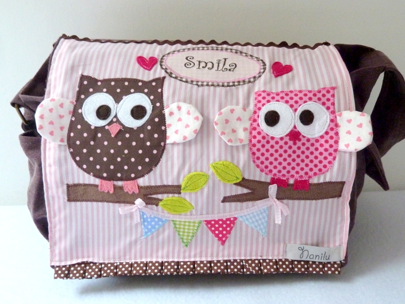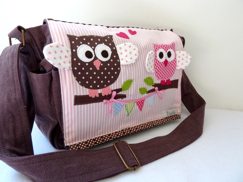 Diese wunderschöne große Canvas- Umhängetasche in Dunkelbraun eignet sich hervorragend als Wickeltasche. Die Tasche ist mit zwei Eulen und Wimpelkette appliziert.